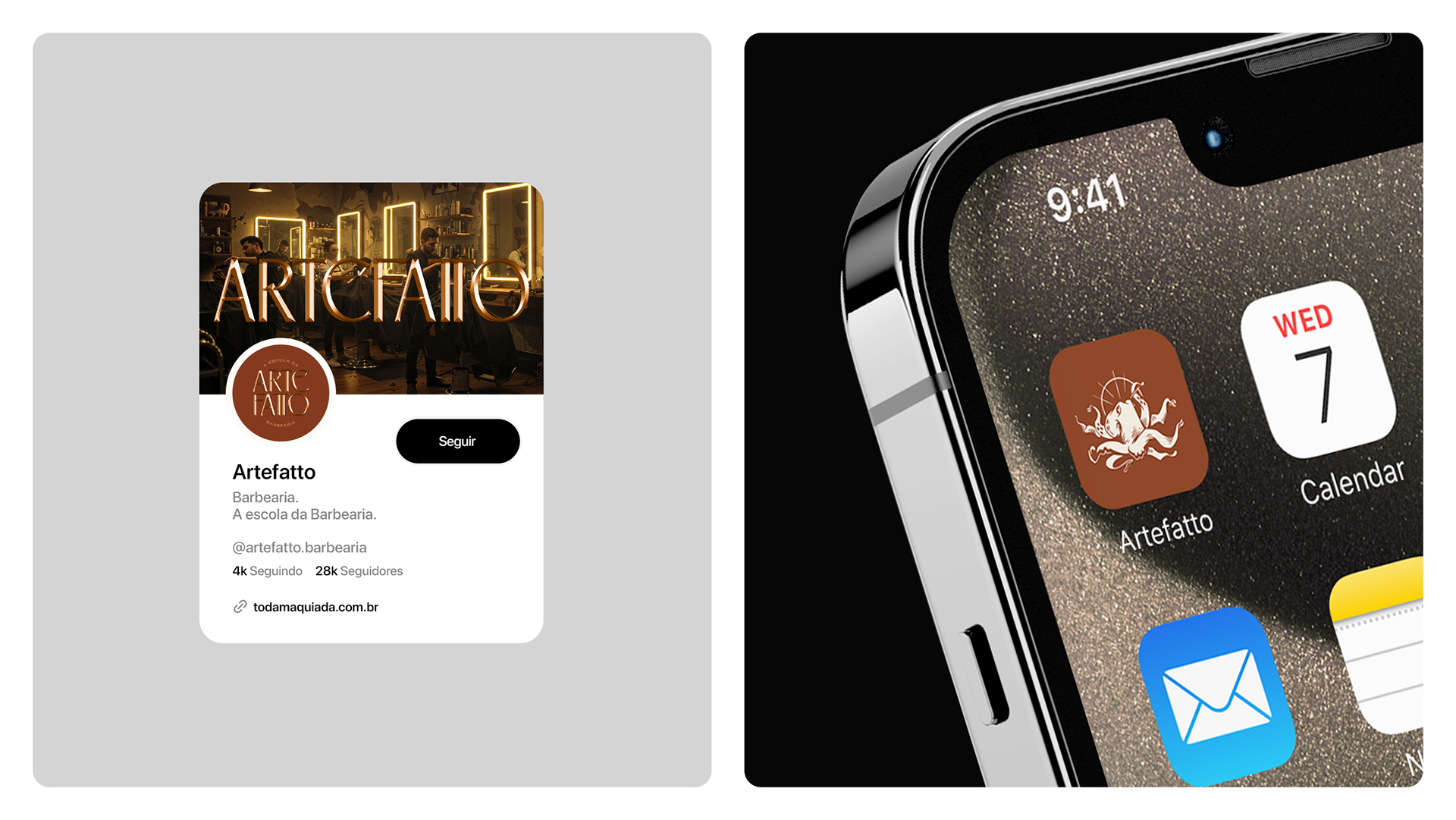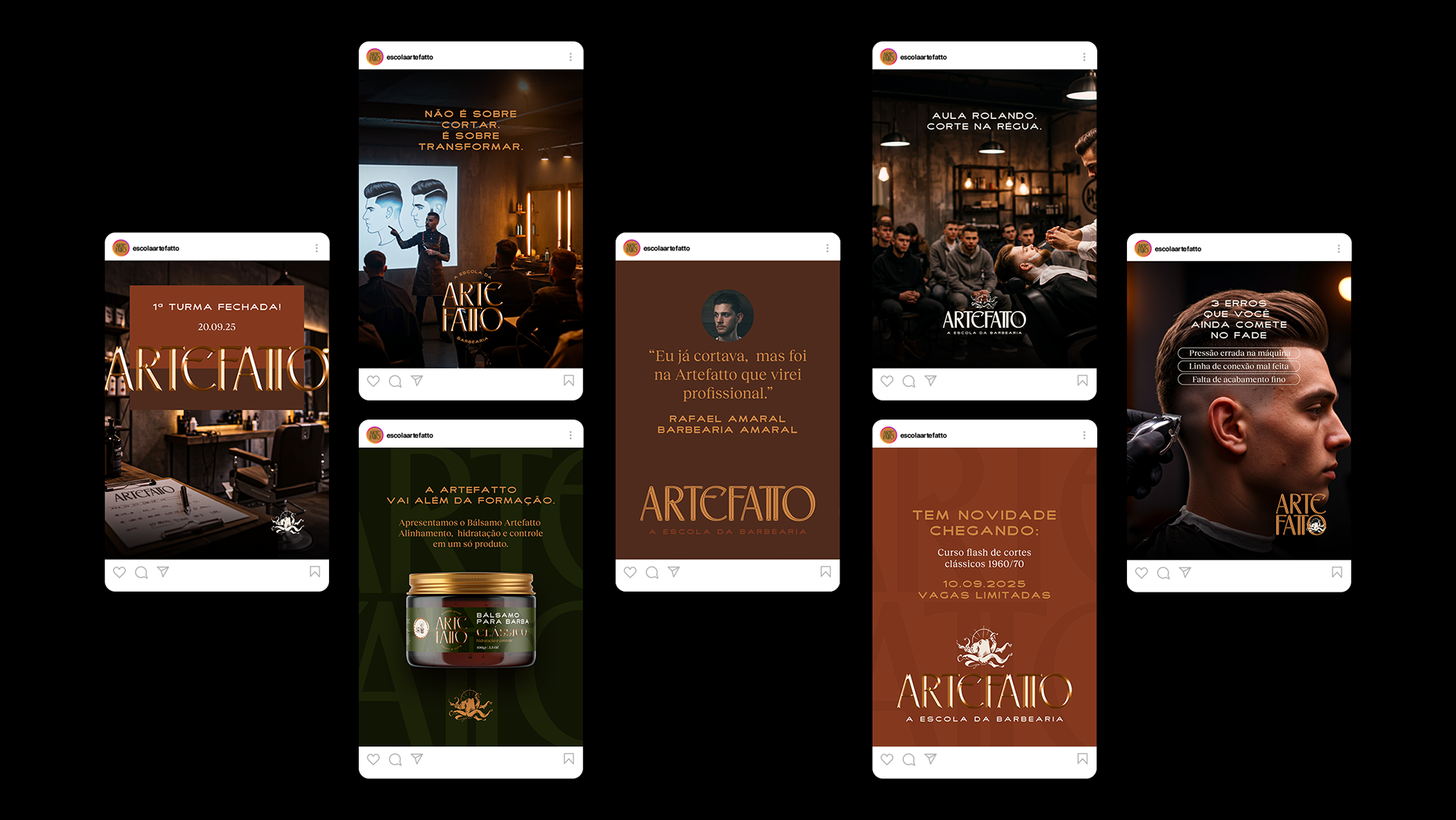 O resultado é uma marca sólida, que comunica com clareza o posicionamento de ser a escola para quem quer mais da barbearia. Uma identidade que legitima a expansão do negócio e posiciona a Artefatto como referência para formar profissionais completos, preparados técnica e estrategicamente para prosperar na carreira.